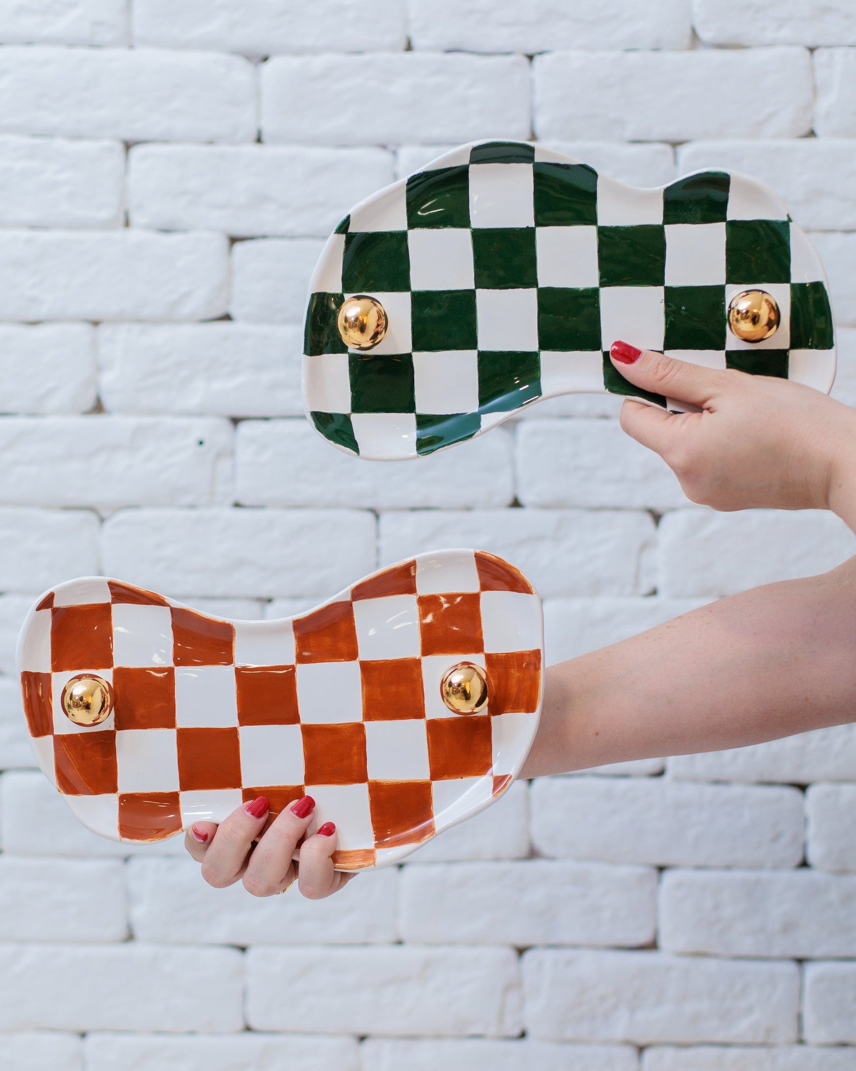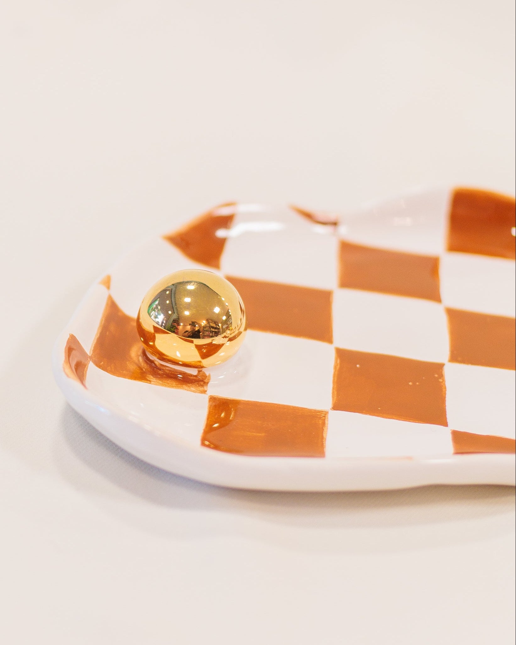Formato ondulado, padrão quadriculado pintado à mão e detalhes dourados em ouro que adicionam charme e sofisticação. Uma peça versátil, ideal para presentear ou transformar pequenos momentos do dia a dia em algo especial.