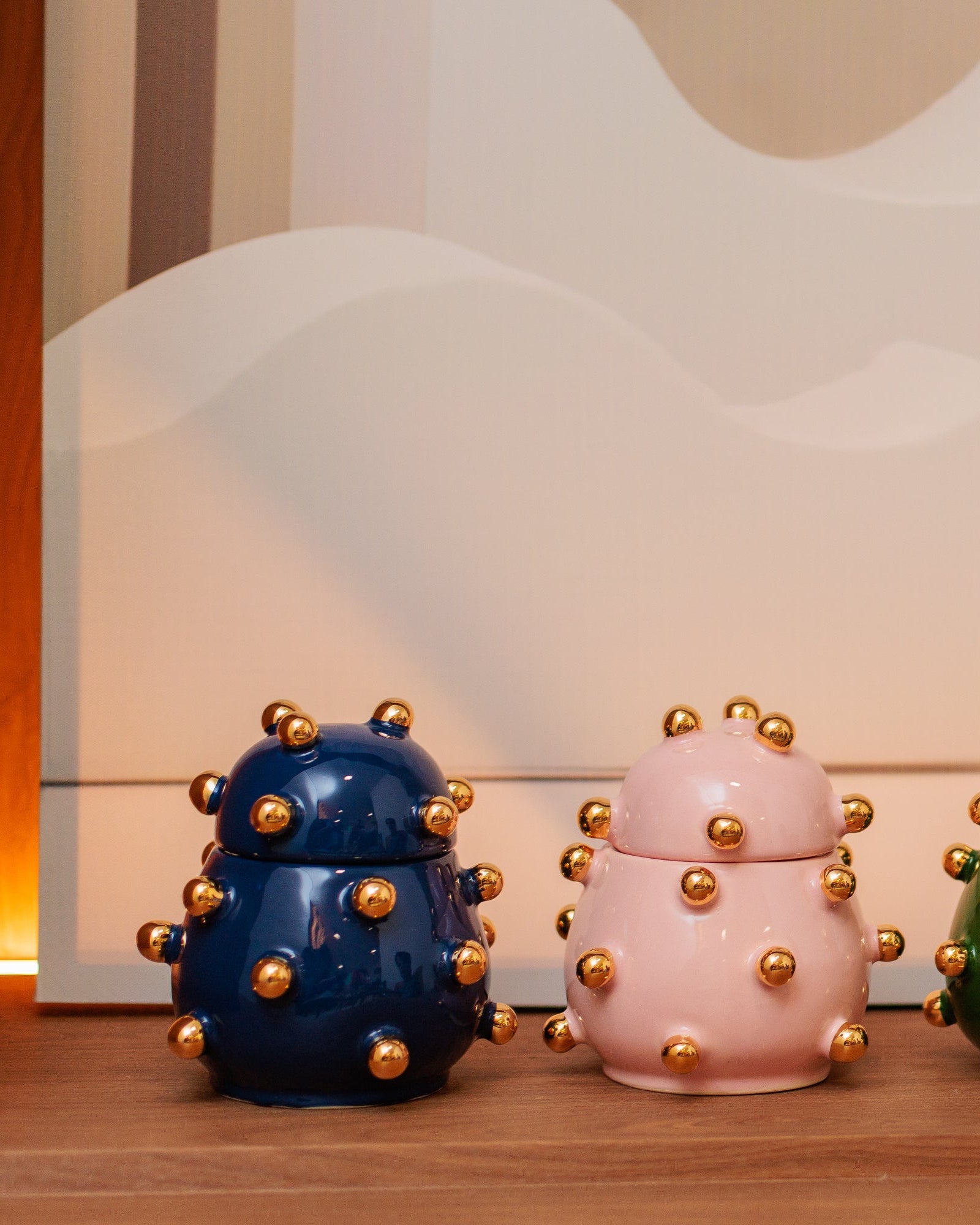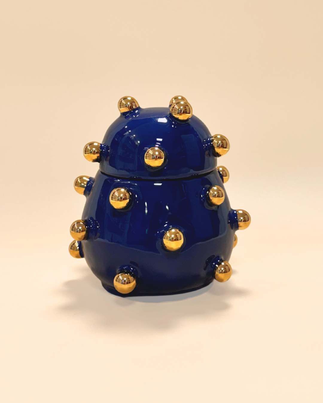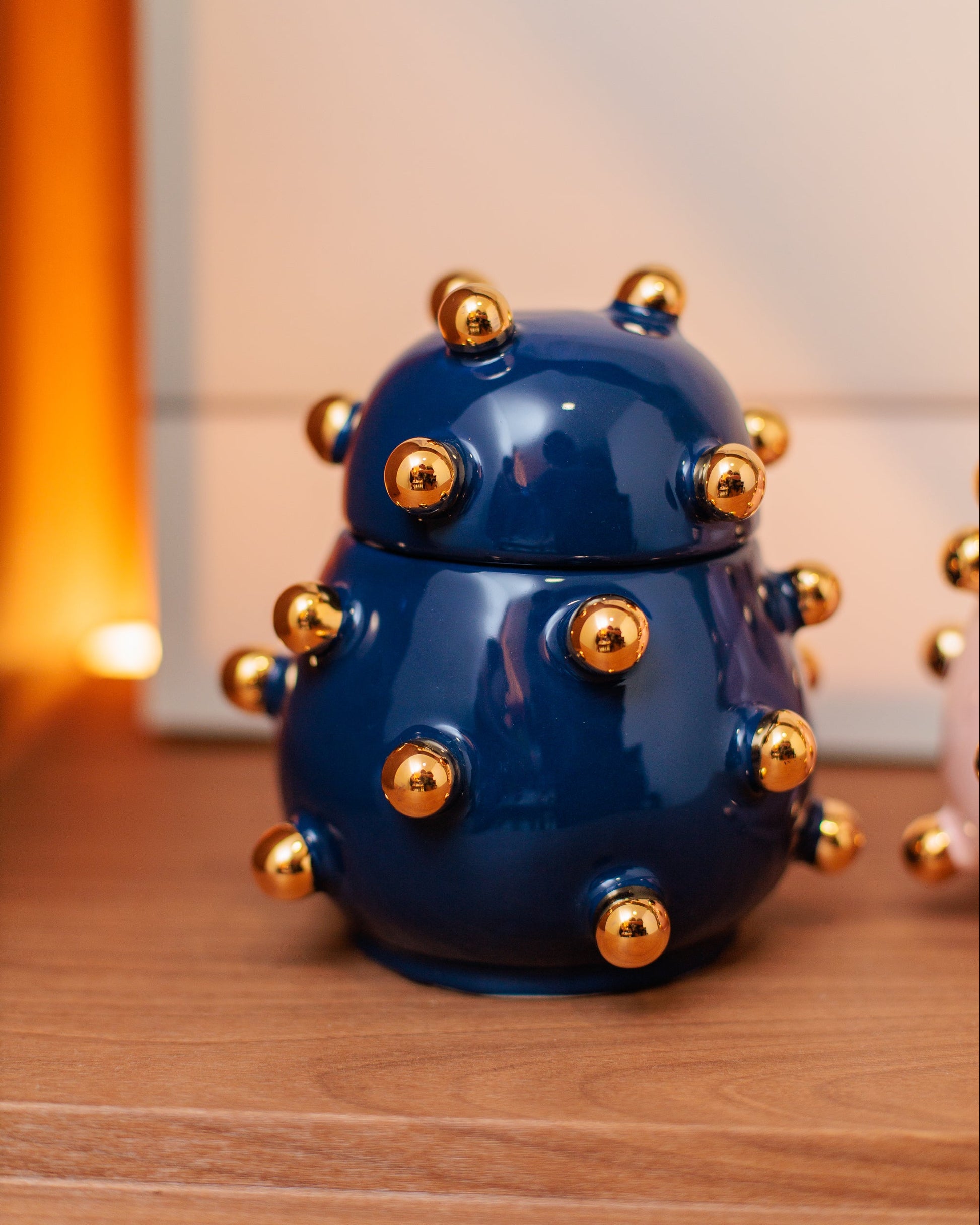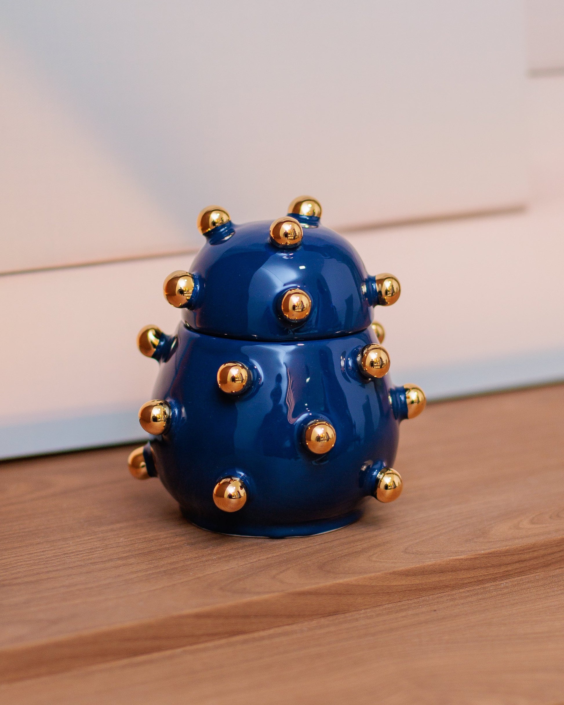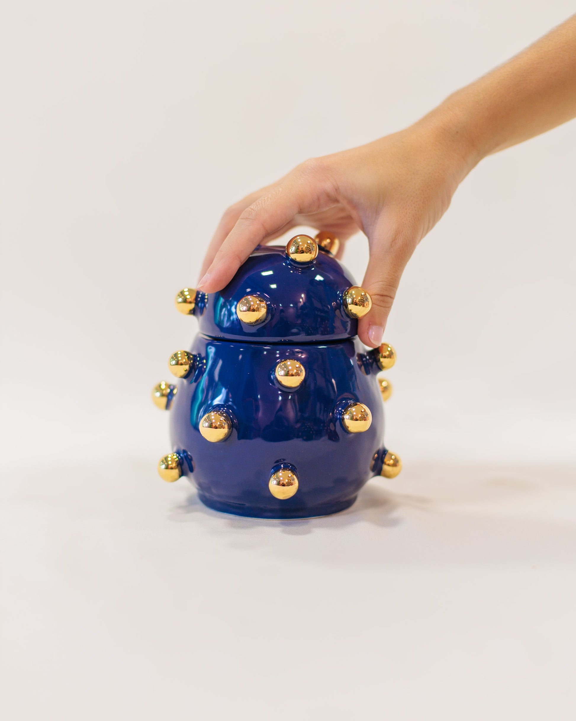 A Caixa Olivia é uma peça em cerâmica artesanal na cor azul marinho com detalhes em ouro, perfeita para dar um toque especial na decoração da sua casa.