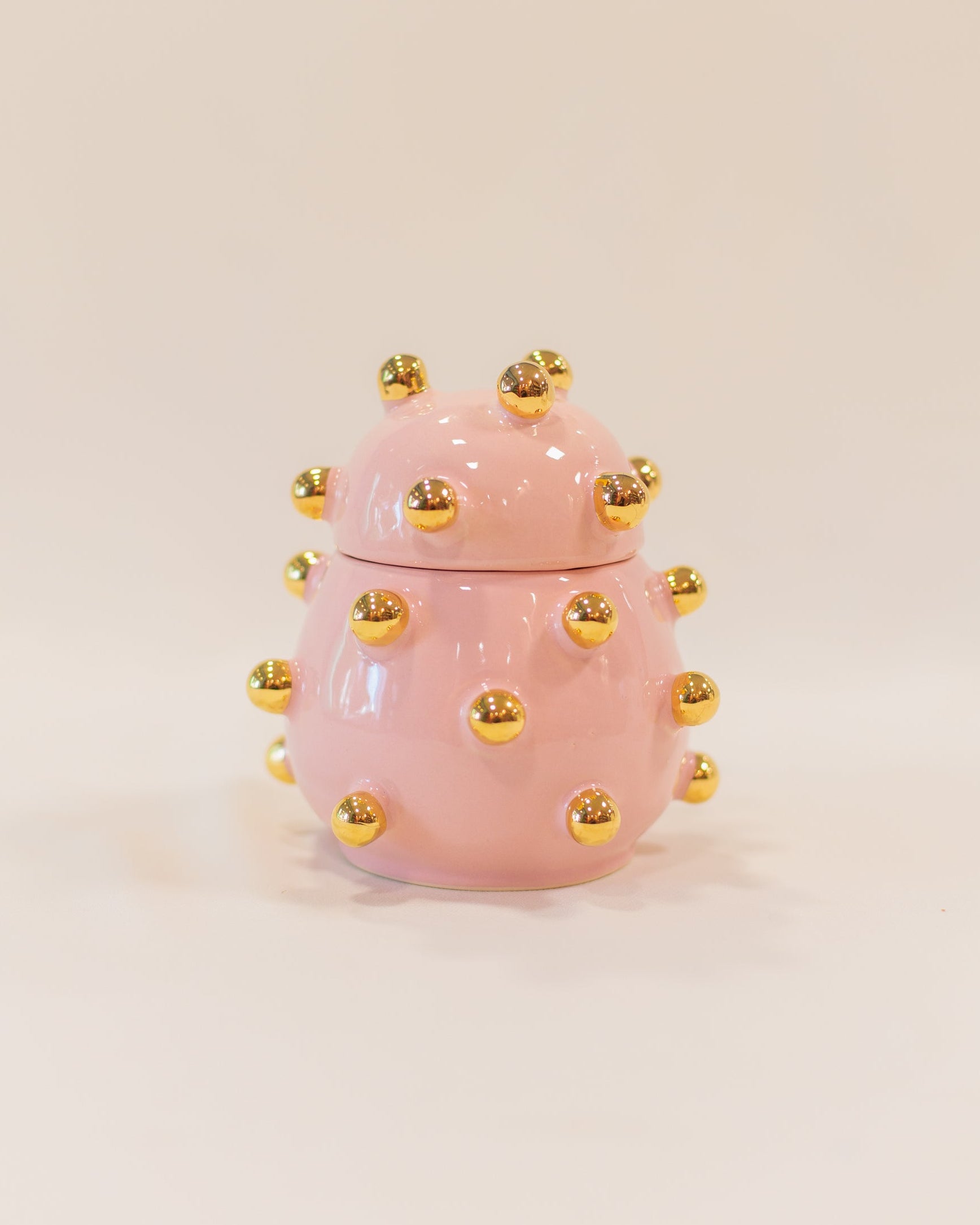 A Caixa Olivia é uma peça em cerâmica artesanal na cor rosa com detalhes em ouro, perfeita para dar um toque especial na decoração da sua casa.