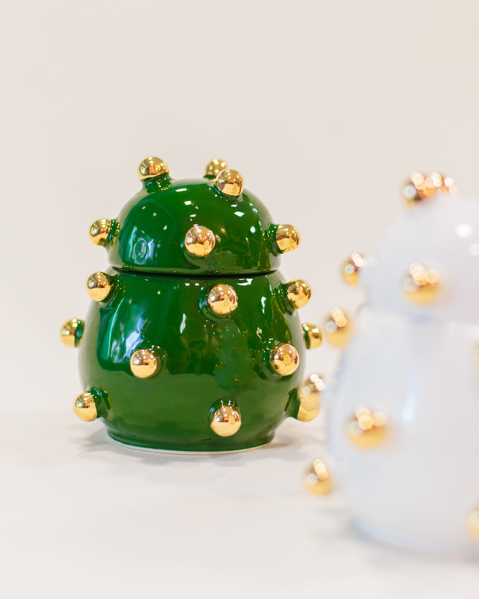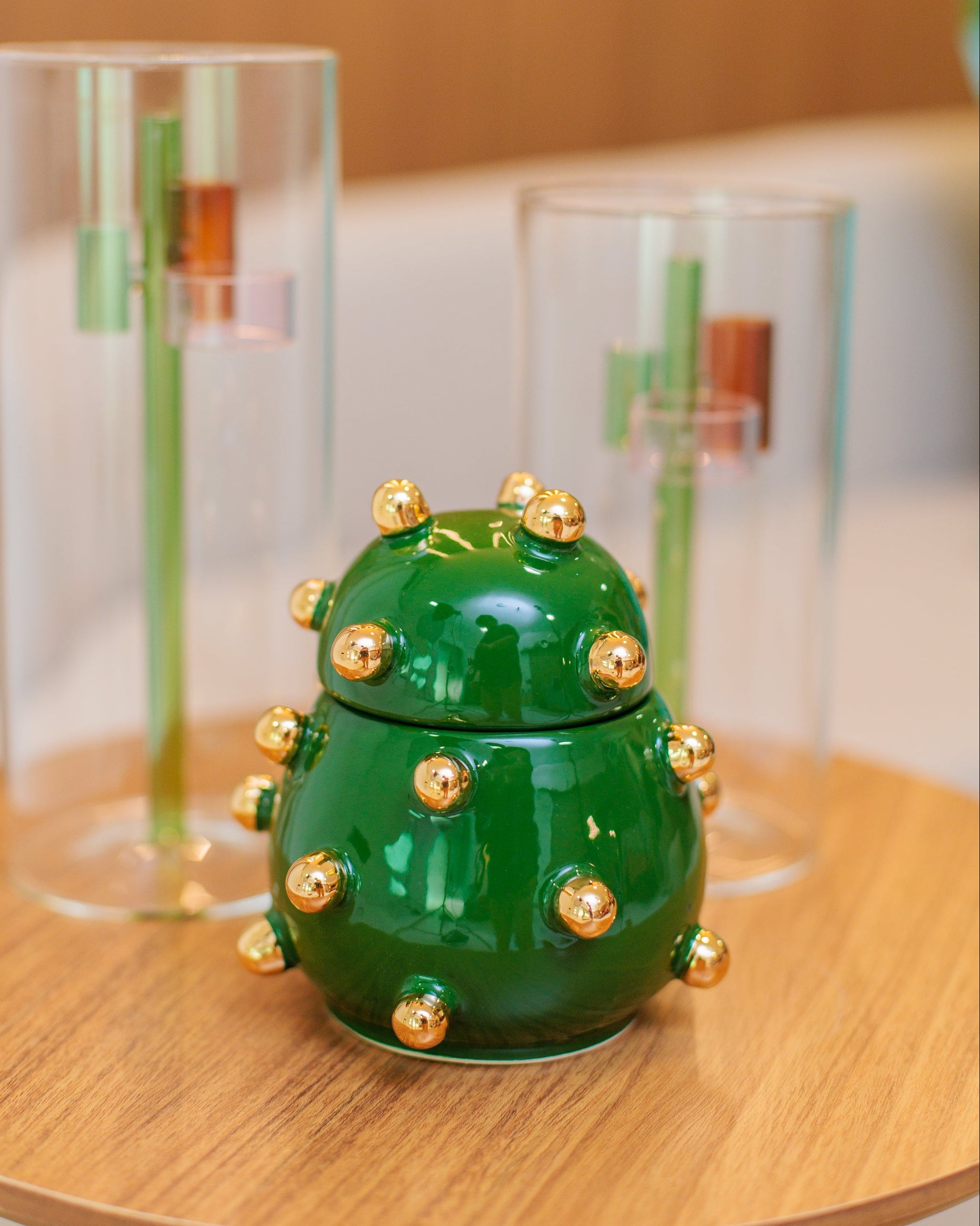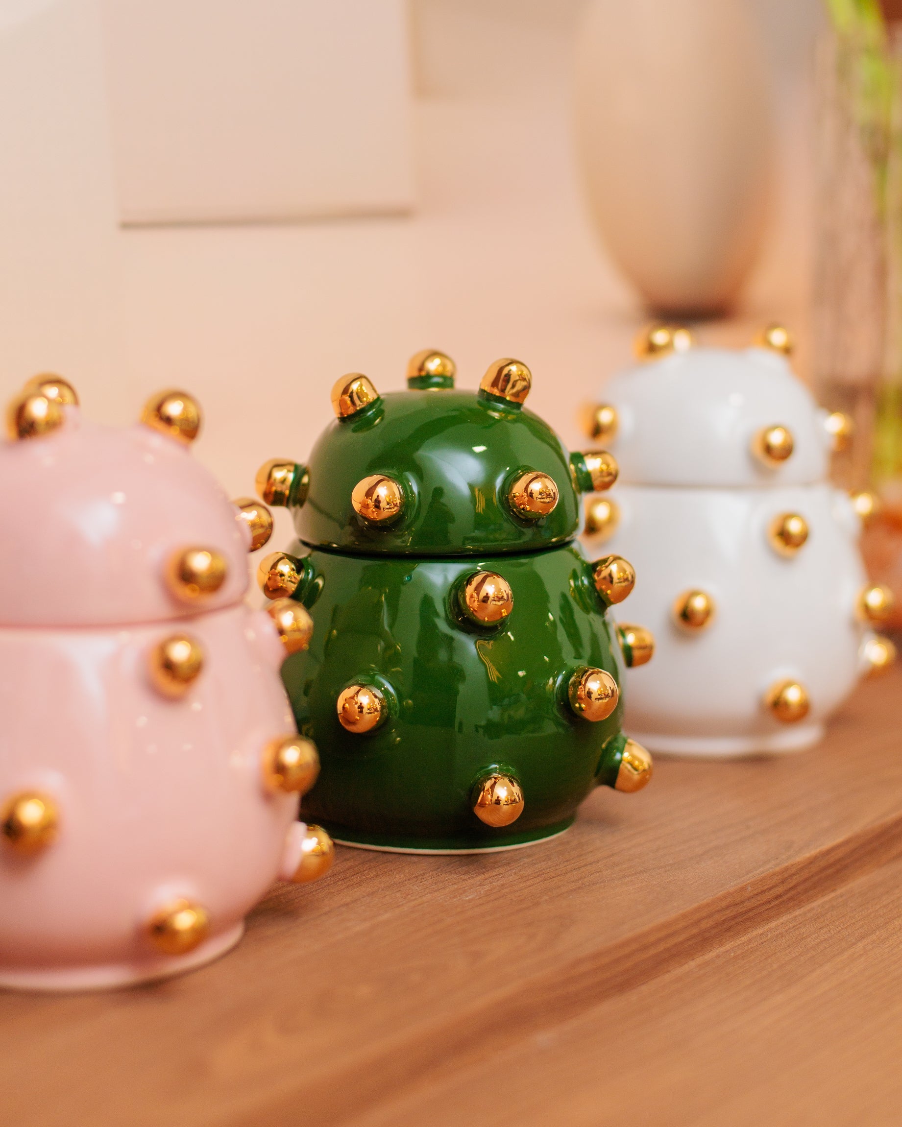 A Caixa Olivia é uma peça em cerâmica artesanal na cor rosa com detalhes em ouro, perfeita para dar um toque especial na decoração da sua casa.