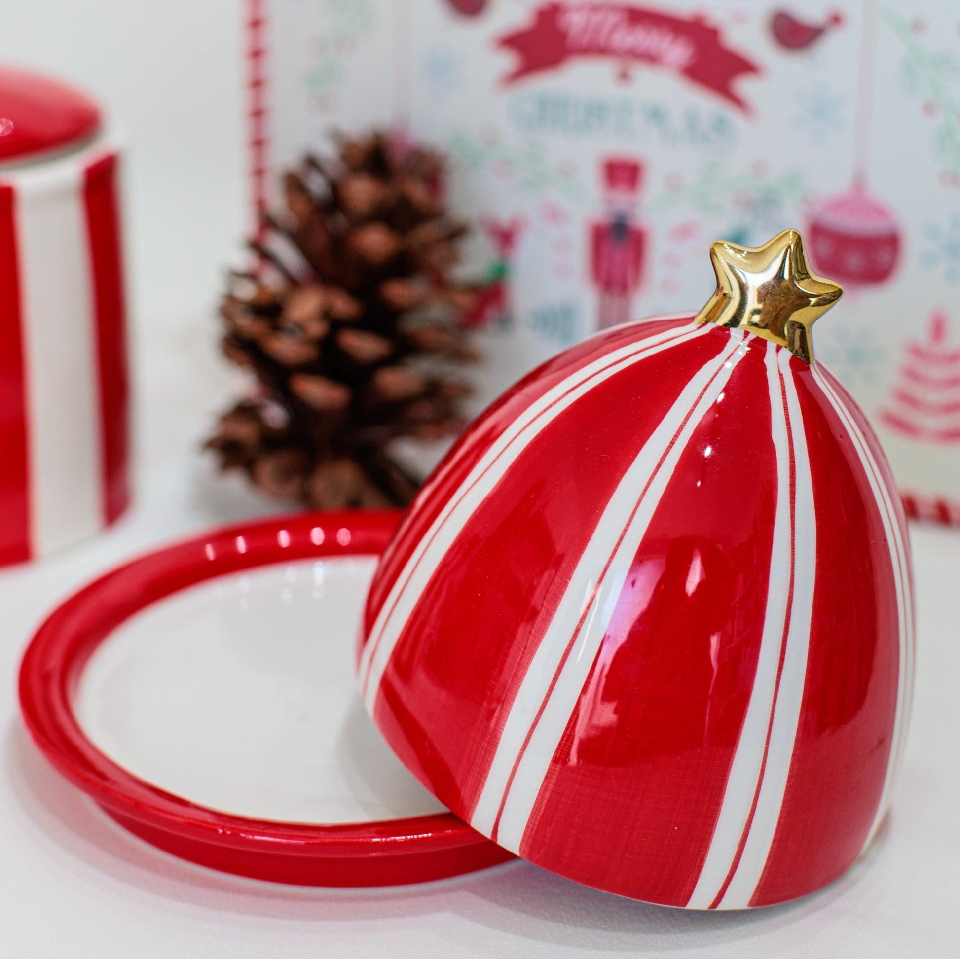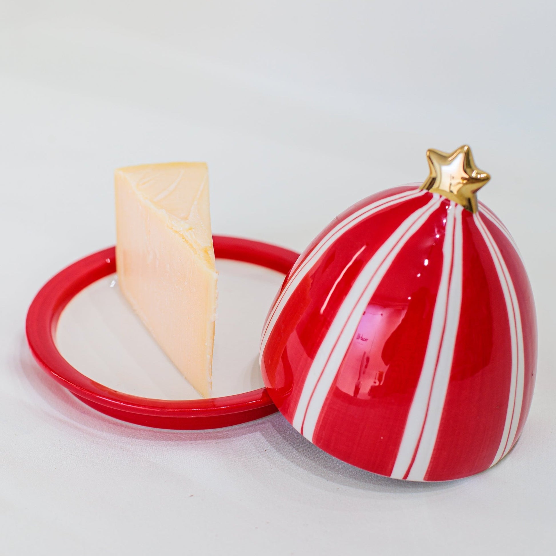 Com listras vermelhas e brancas e um toque dourado na estrela no topo, essa queijeira é o detalhe perfeito para dar um charme especial às suas celebrações. Ideal para servir queijos e até outros petiscos com muito estilo e espírito natalino. Uma peça funcional e cheia de charme para deixar a sua ceia ainda mais mágica!