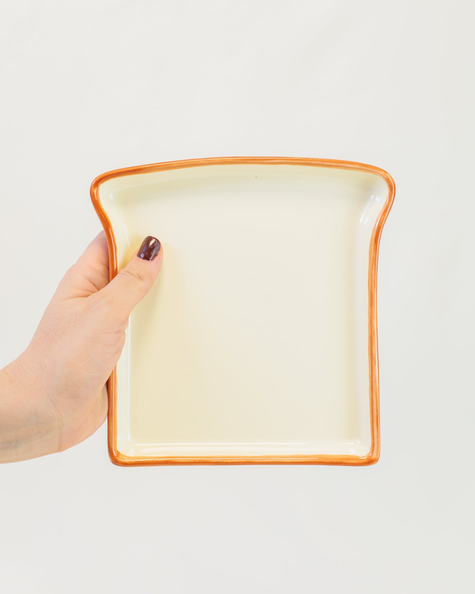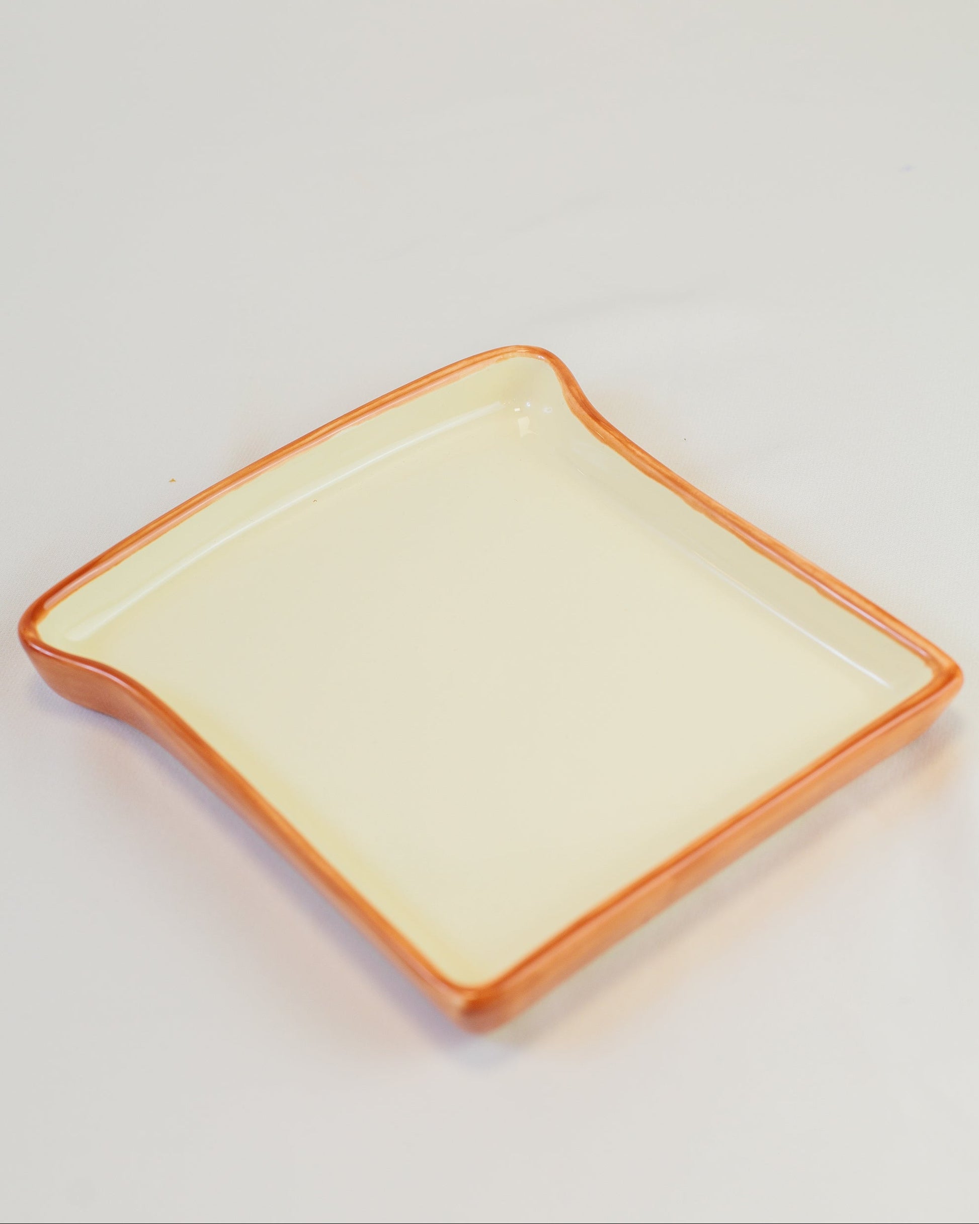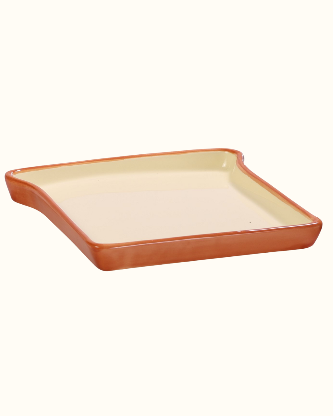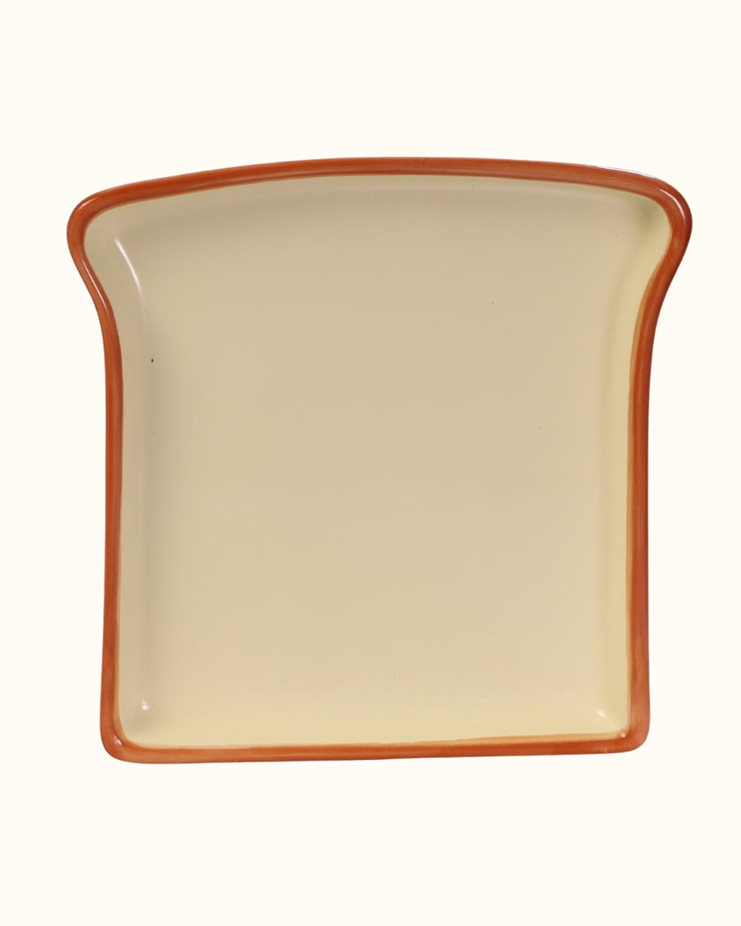 Prato em formato de pão de forma, feito em cerâmica pintada à mão