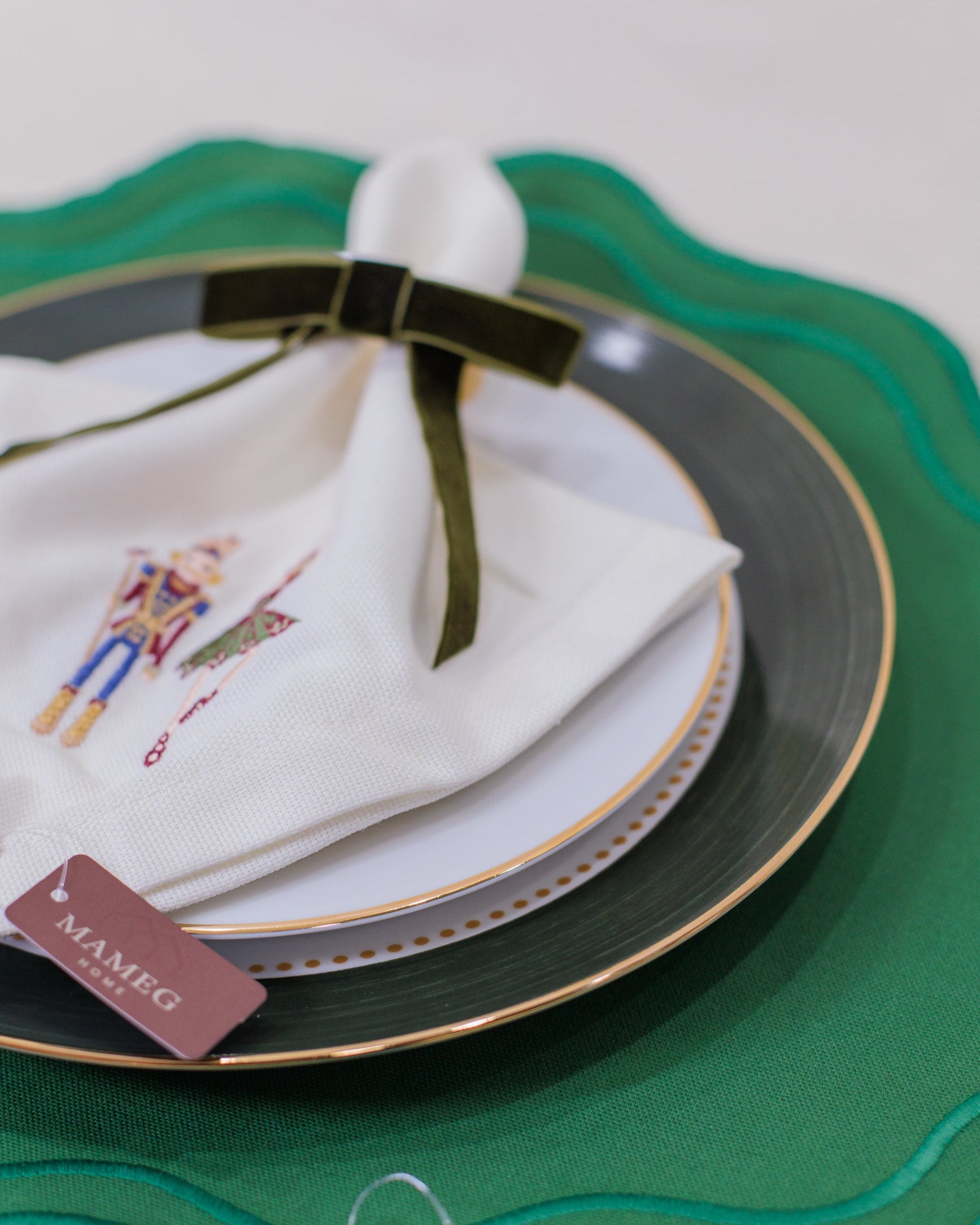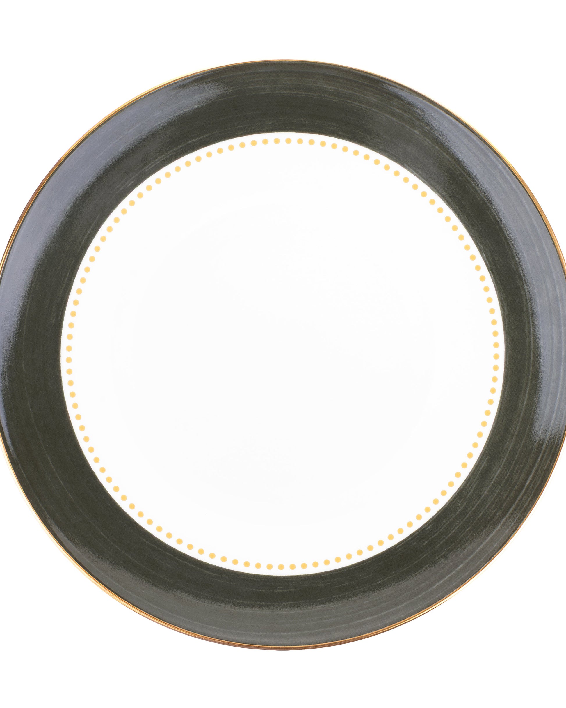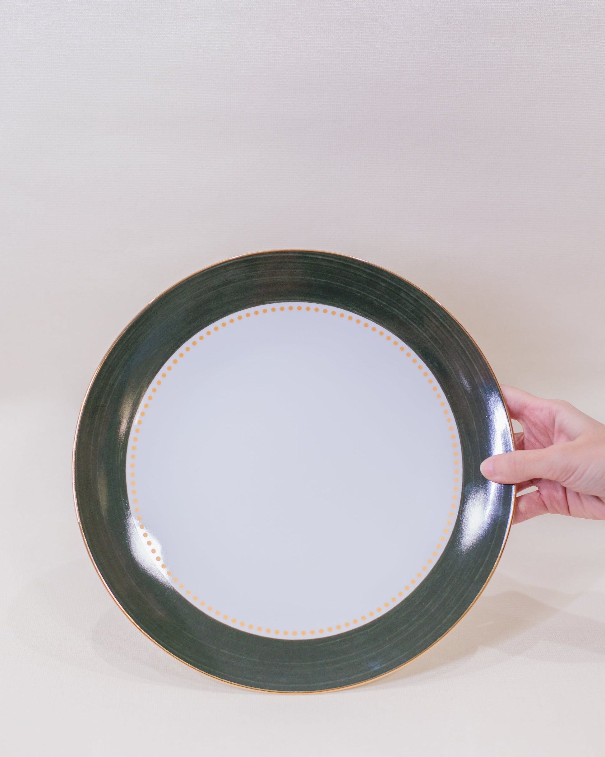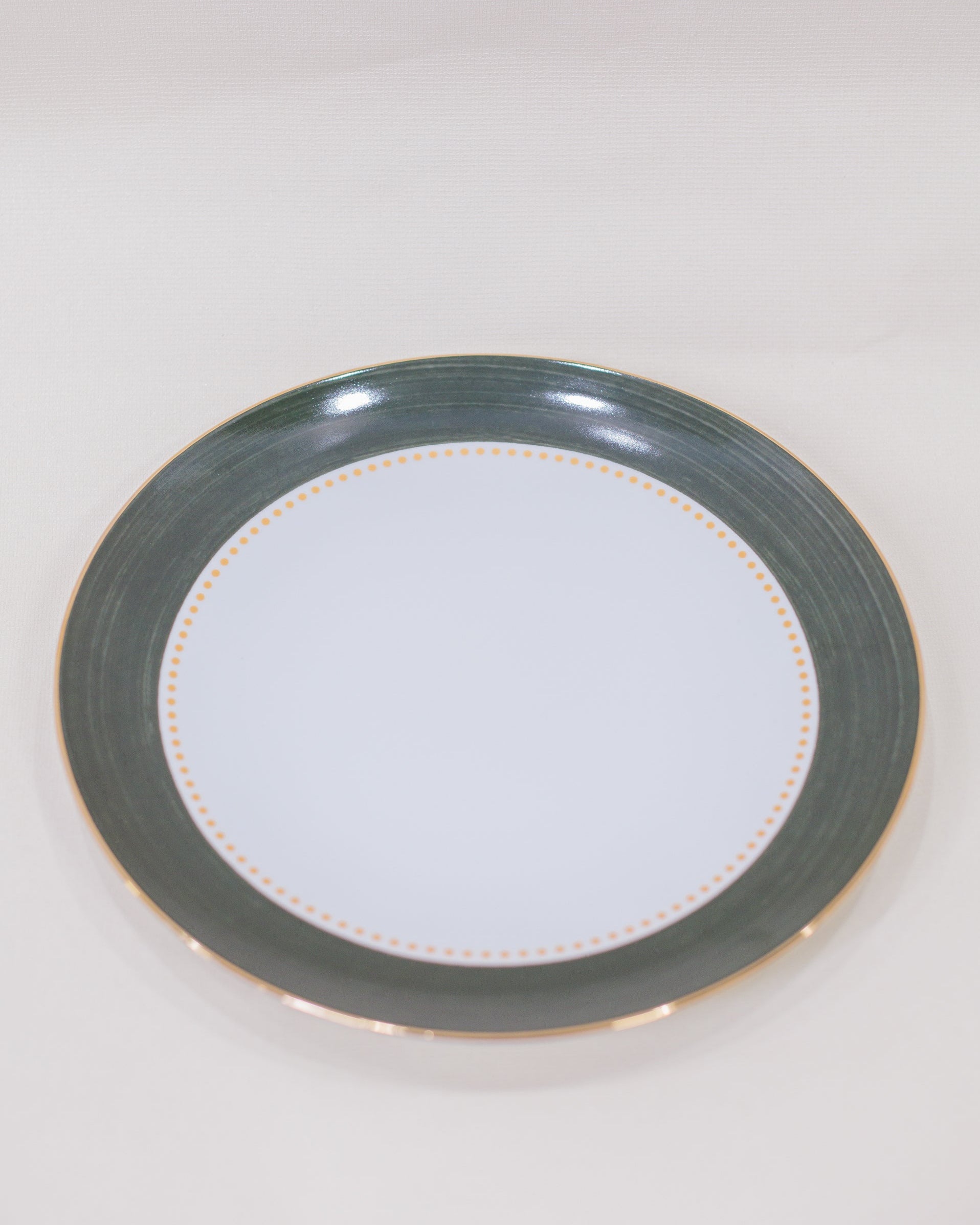 Prato raso branco com borda decalque na cor verde e filete de ouro.