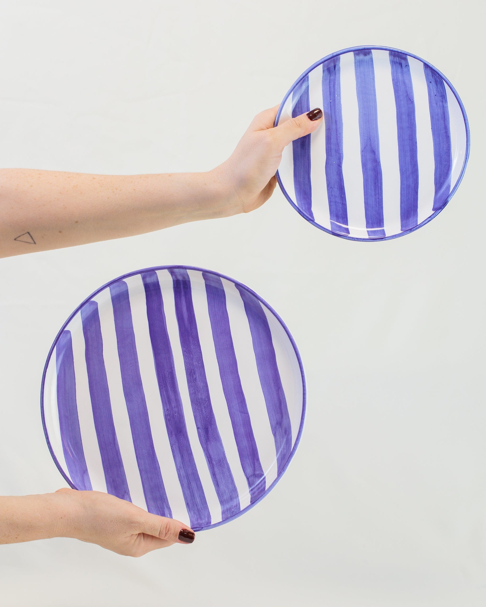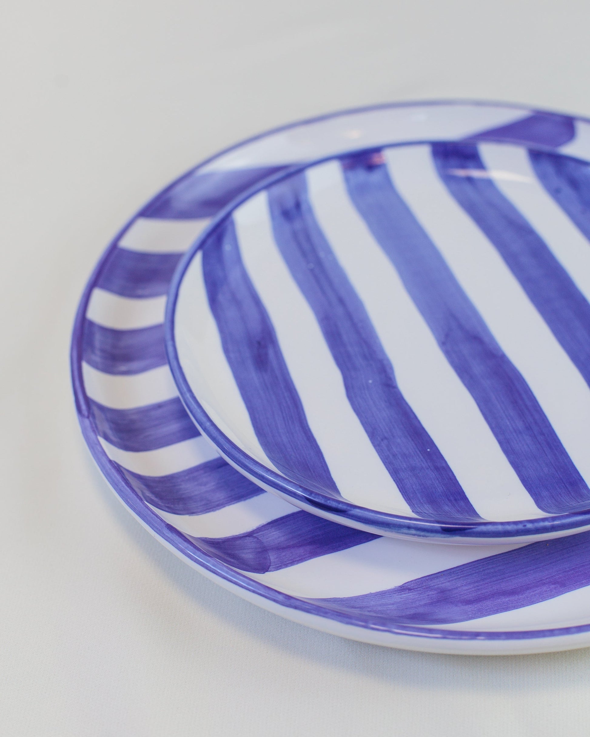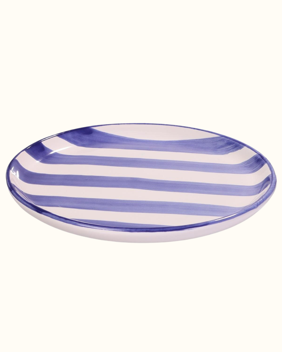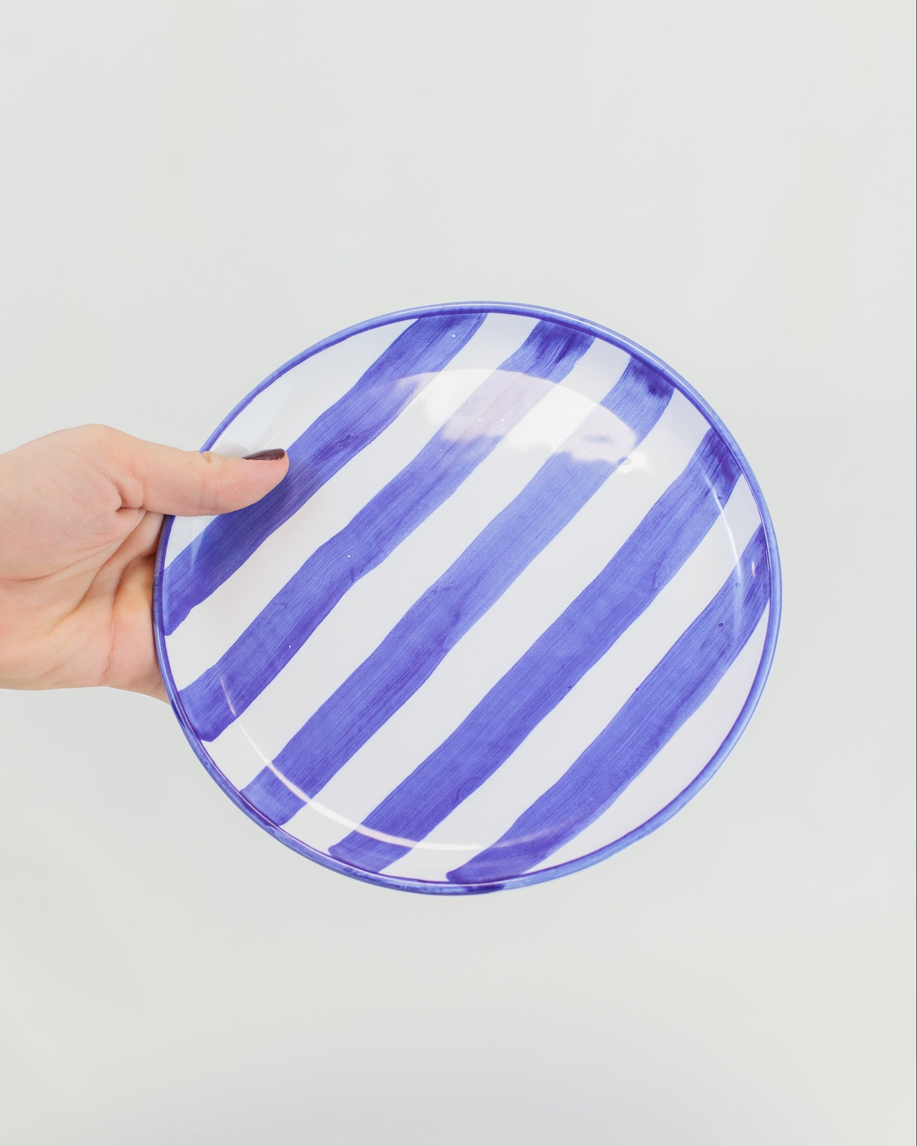 Prato liso pequeno com listras azuis, feito em cerâmica pintada à mão