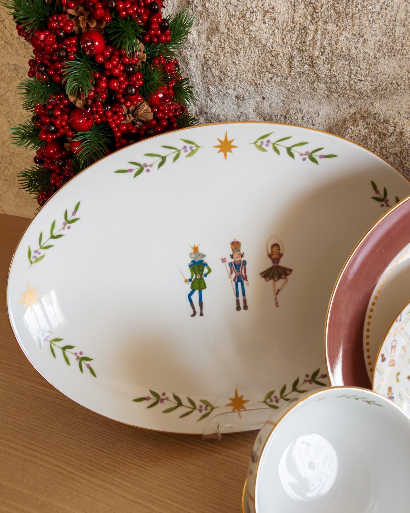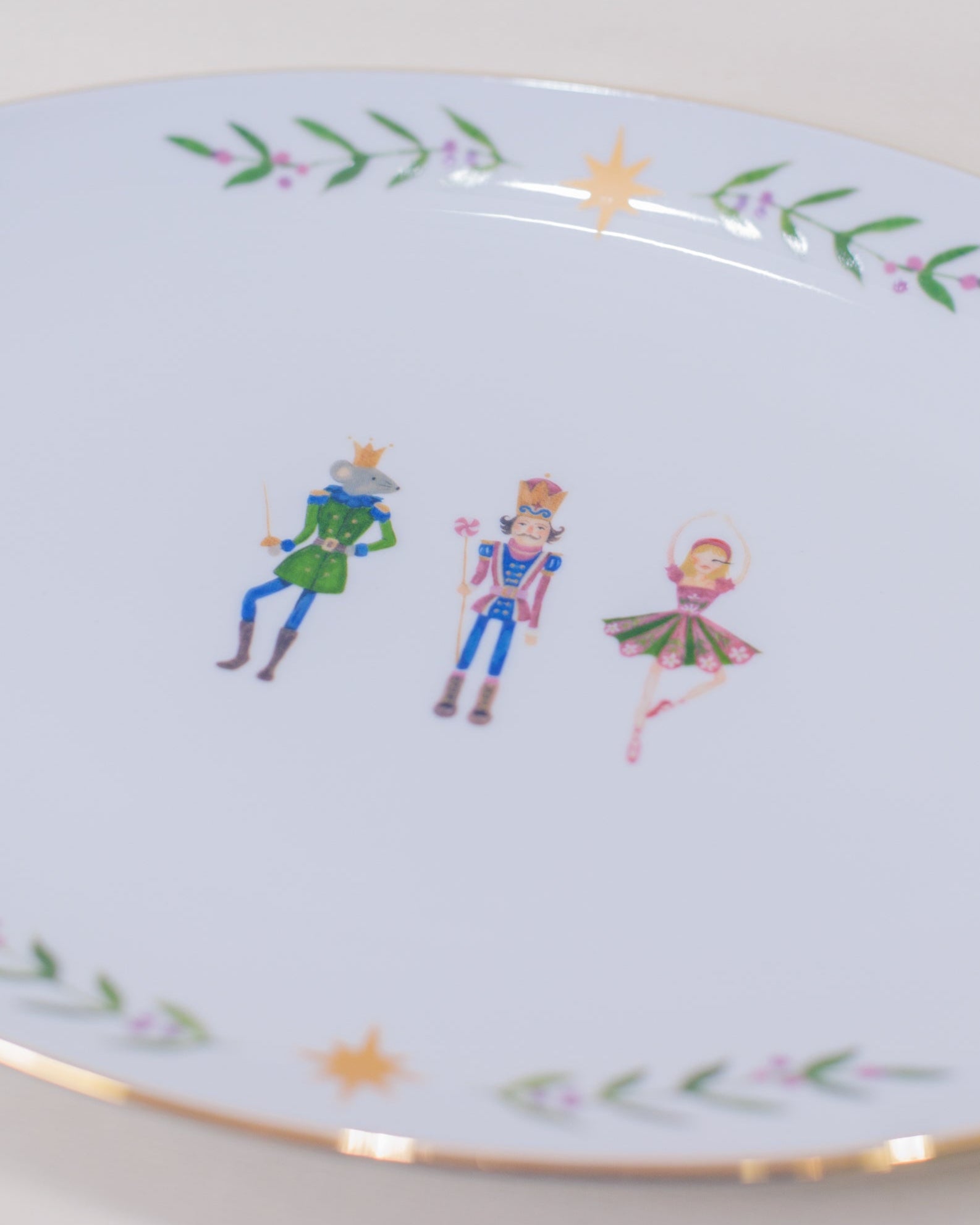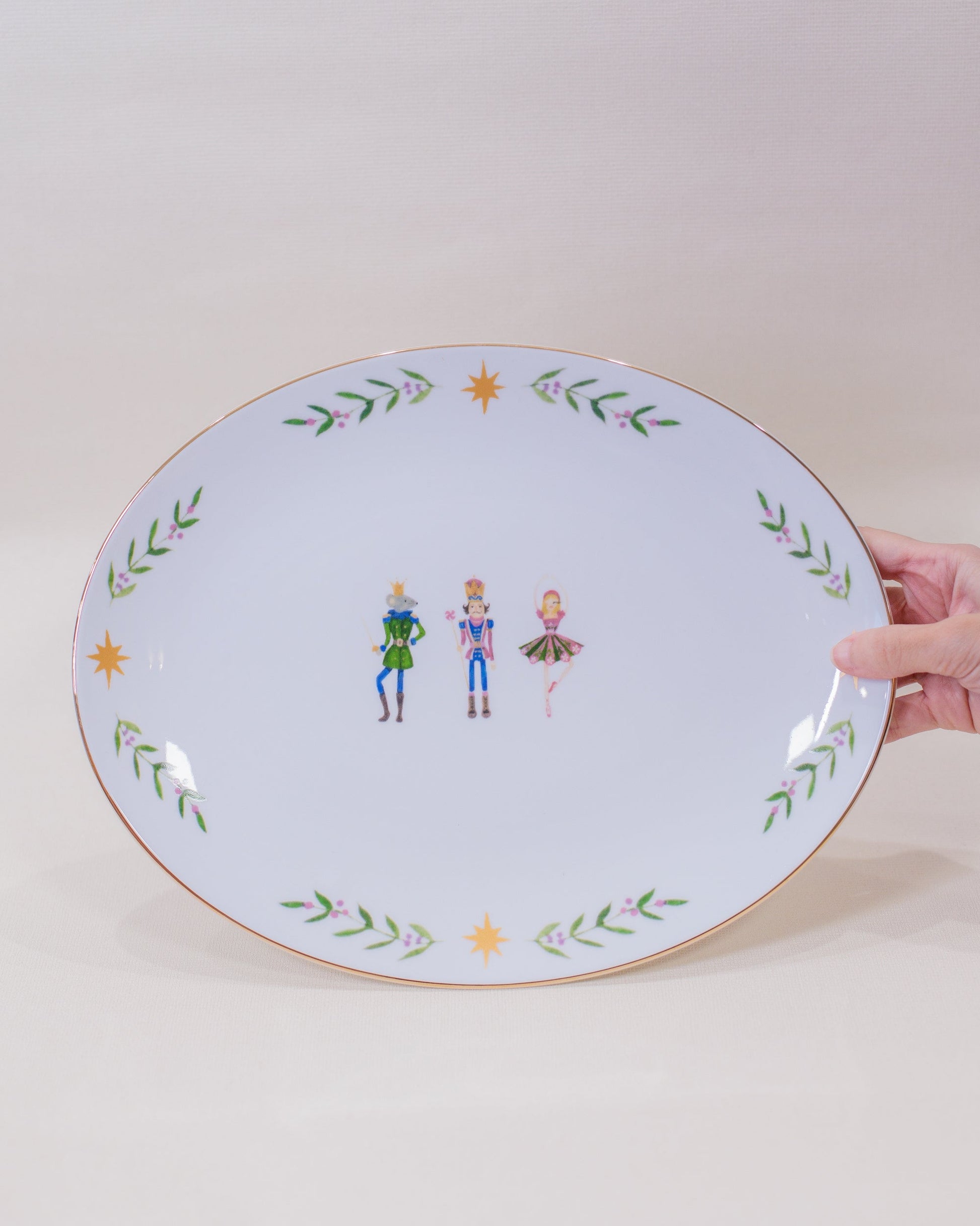 Travessa branca média com borda estampa flor de louro, quebra nozes no centro e filete de ouro em toda a borda.